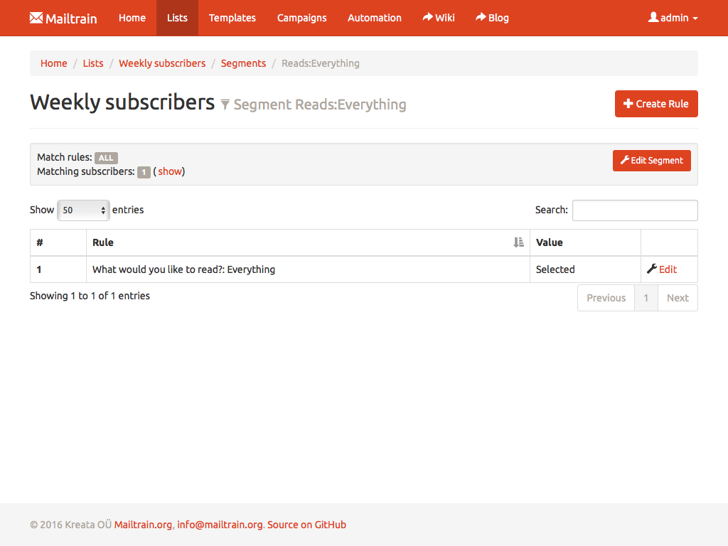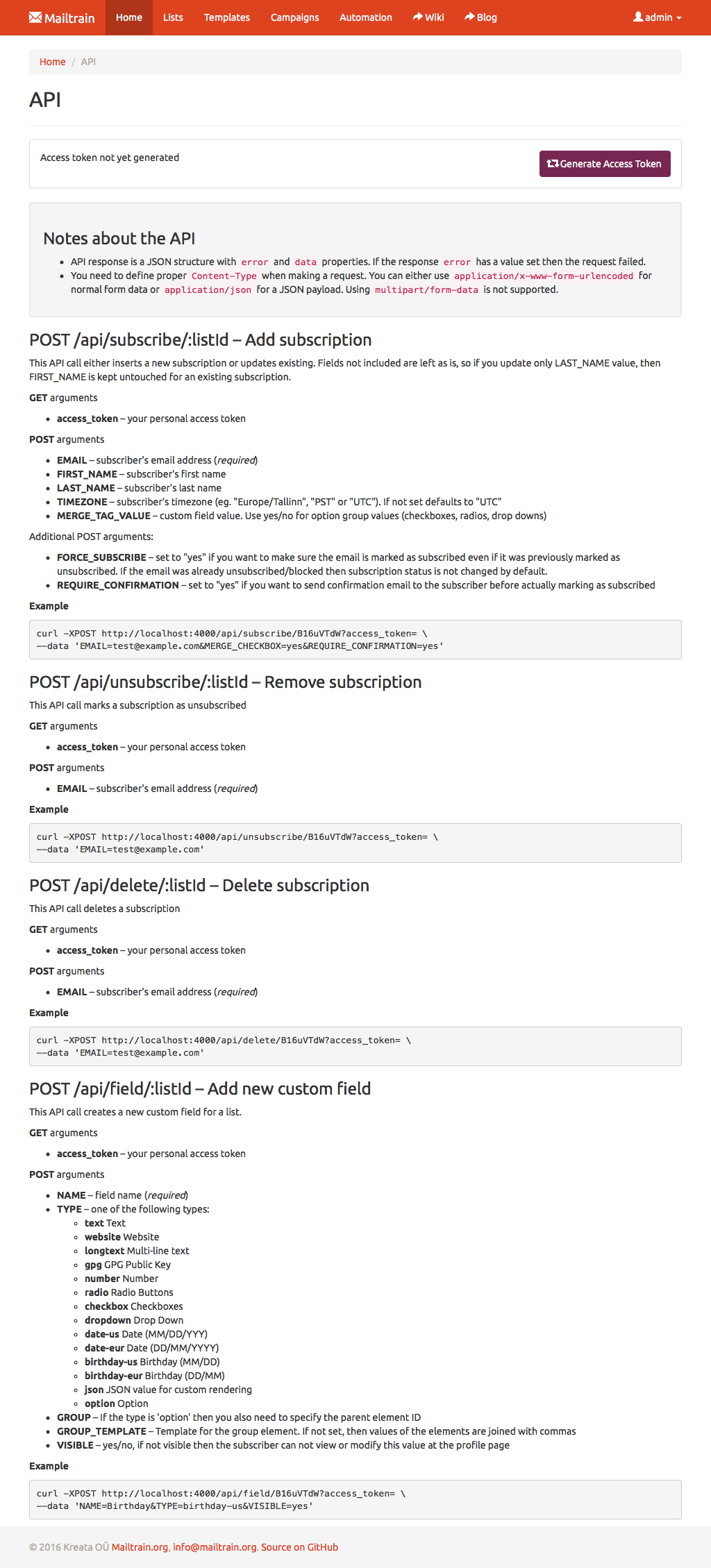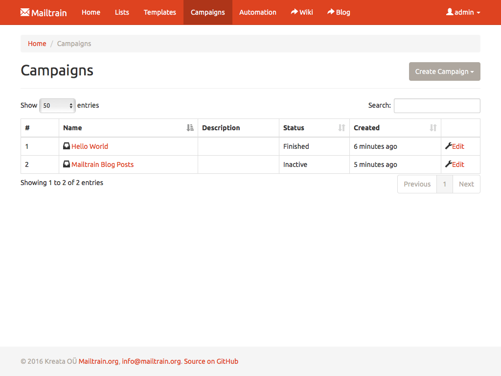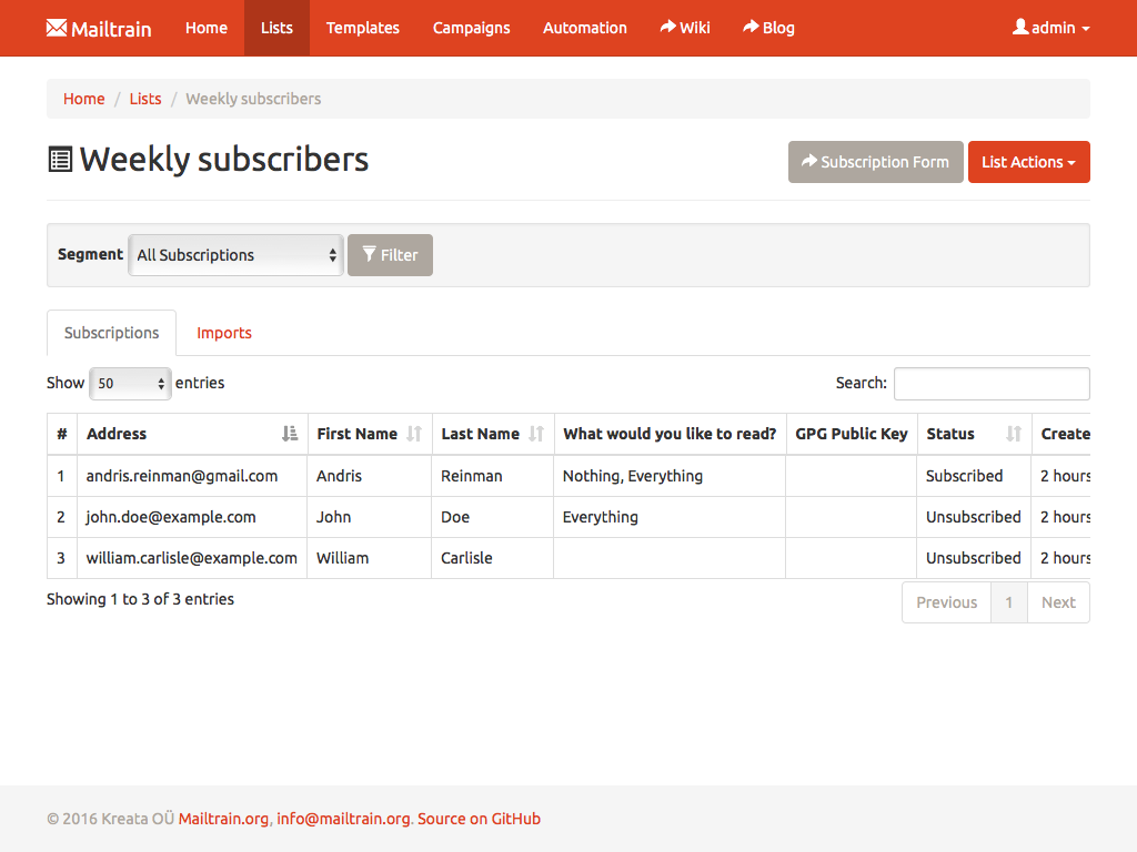 Mailtrain allows you to easily manage even very large lists. Million subscribers? Not a problem. You can add subscribers manually, through the API or import from a CSV file. All lists come with support for custom fields and merge tags as well.